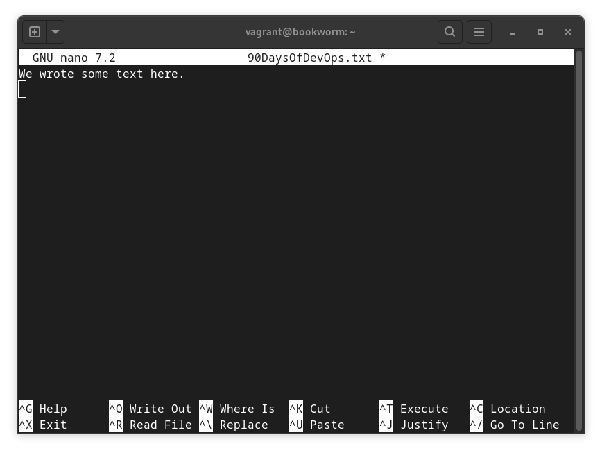 On our VM, we use it to create a new file, 90DaysOfDevOps.txt:
