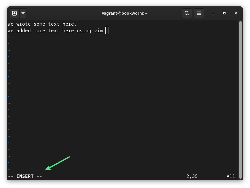 In our vim session, we switch to insert mode by pressing i, and then type another line of text into our document.