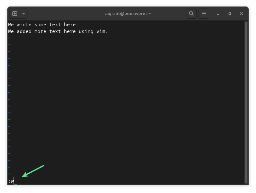 :, which opens a vim-specific command prompt at the bottom of the editor. This prompt supports many complex commands but we just want the basics for this blog post.