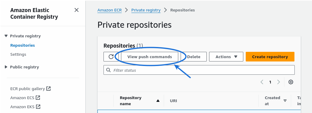 Since the container run from our image tested ok, we are ready to push the container image to ECR. The CLI commands involved can be very long with lots of room for error, so it helps to get them directly from the AWS Console.